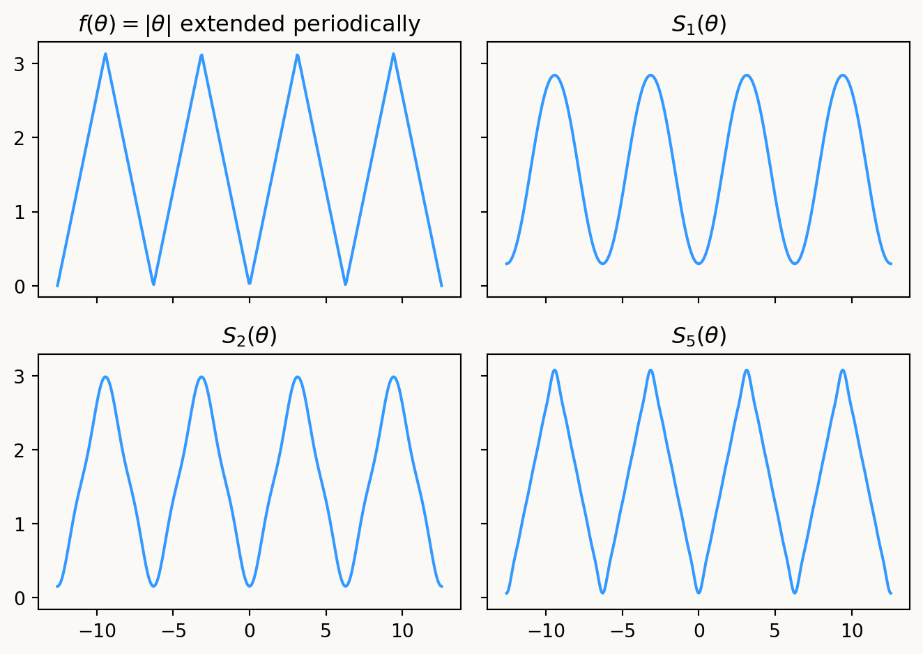 axes[0, 0].set_title(r"$f(\theta) = |\theta|$ extended periodically")